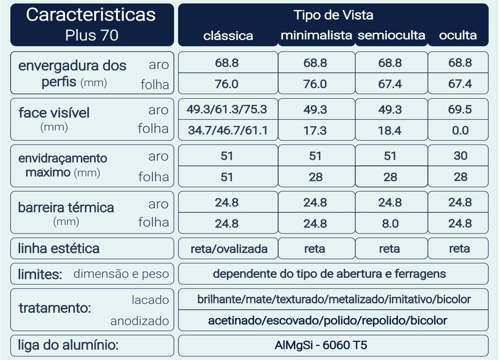 • No sistema Plus 70 essa orla é de cerca de 17mm que, combinada com um aro fixo de expressão reduzida, permite um fraco impacto de alumínio no envidraçado.