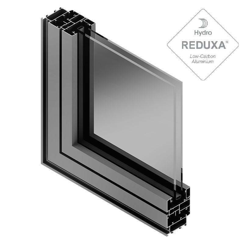 Módulo 55 mm sem rutura da ponte térmica com folha vista e uma estrutura equilibrada entre aro fixo e folha (87.5 mm) para um aspeto visual de grande qualidade.